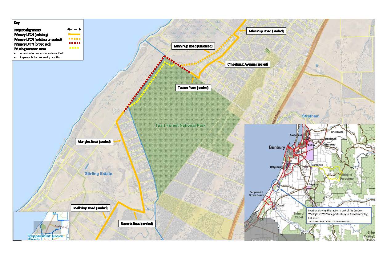 As part of the Bunbury–Wellington 2050 Cycling Strategy, a new 1.8 km sealed cycle path is planned along the western edge of Tuart Forest National Park, within the Shire of Capel’s Road reserve. This path will link Tatton Place in Stratham to Mangles Road in the Stirling Estate, forming a key section of a broader initiative to create a safe, scenic, and family-friendly cycling network between Bunbury and Busselton.